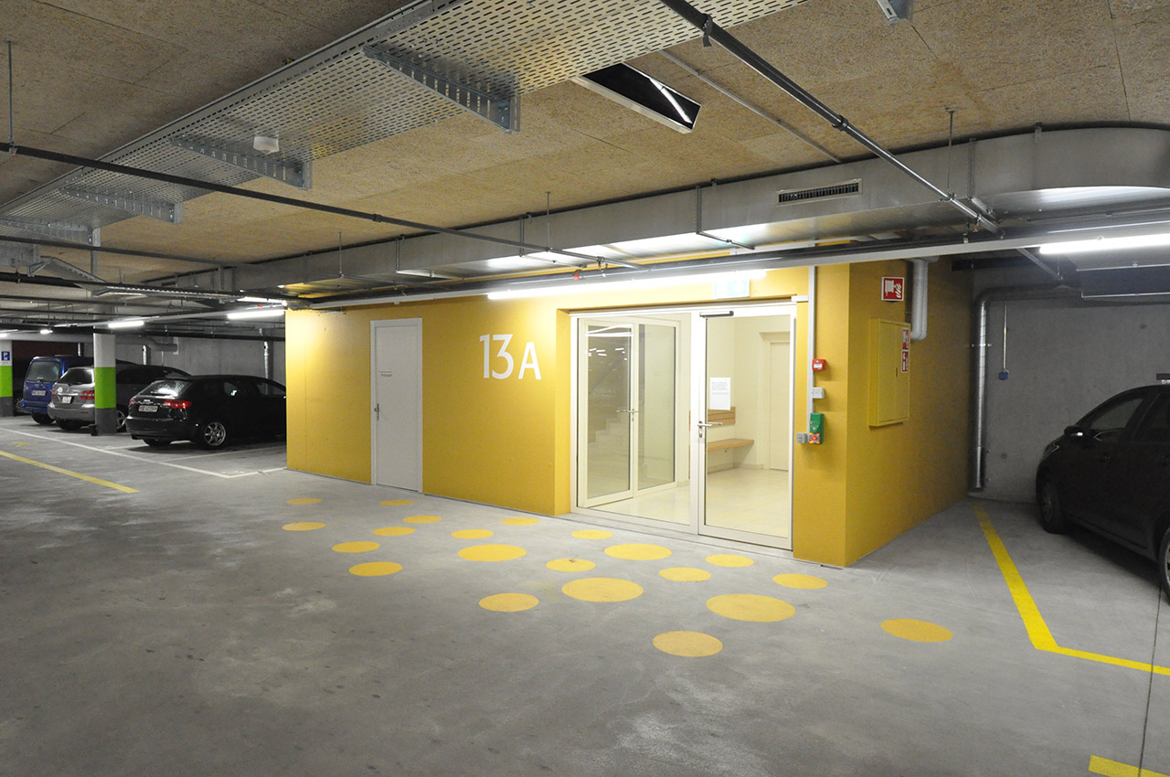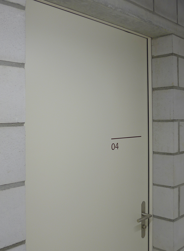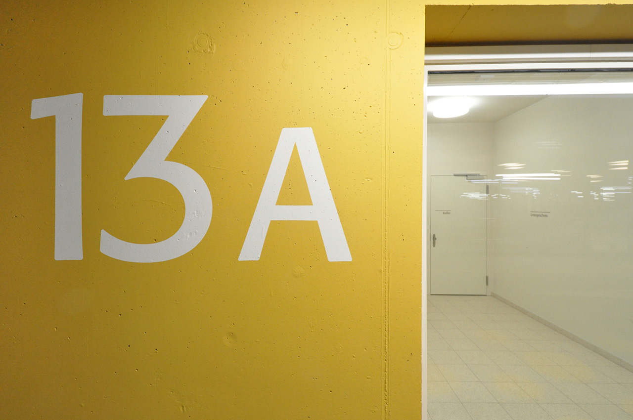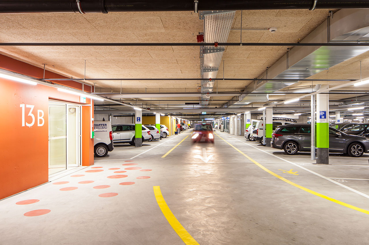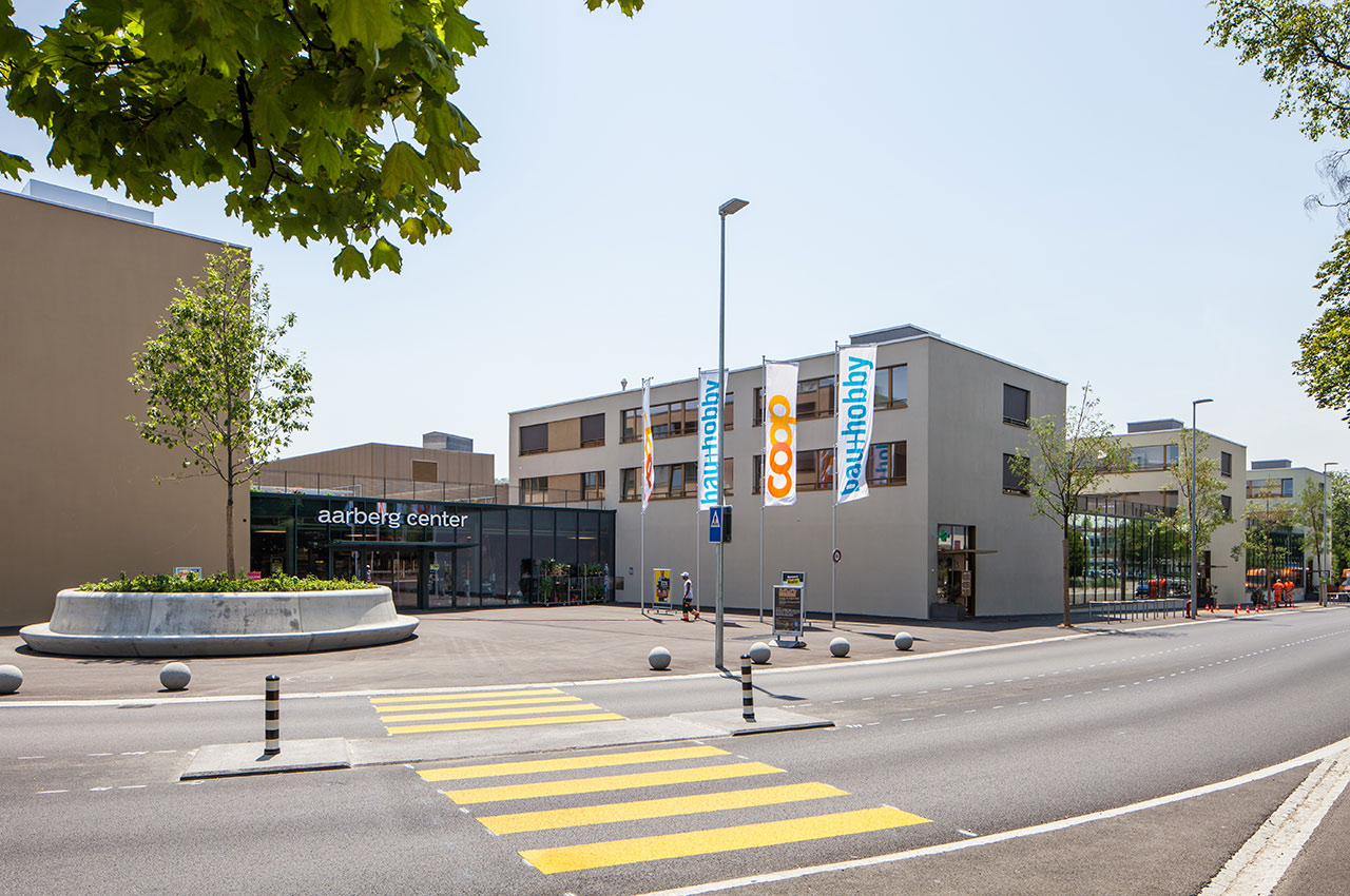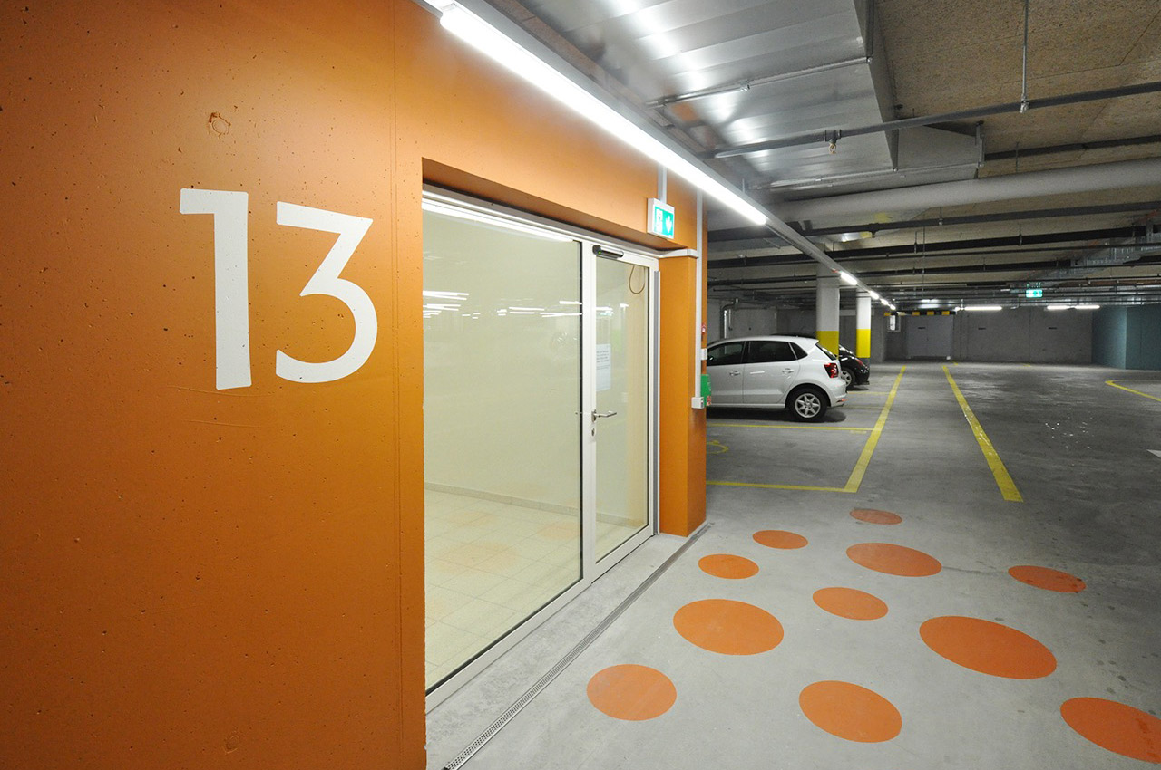 Am Aarbergcenter wurden verschiedene Maßnahmen zur Signalisierung umgesetzt, die die Eingänge, die Parkgarage und die Kellerräume umfassen. Hierbei wurden Schablonierungen, Folienbeschriftungen und decoupierte Ziffern verwendet.