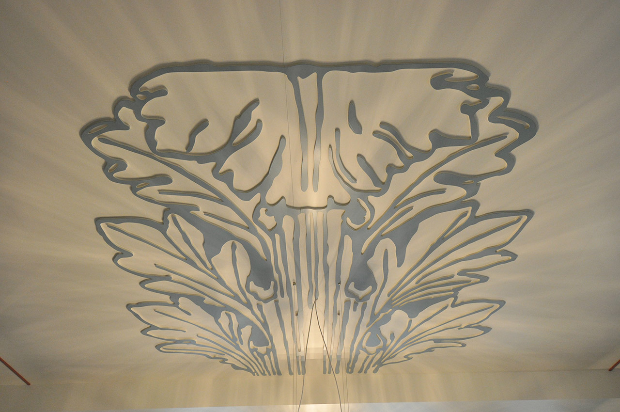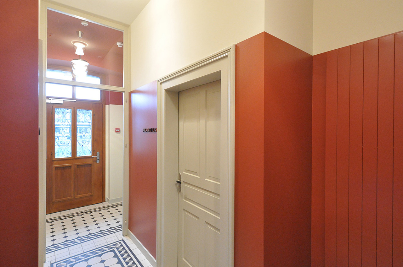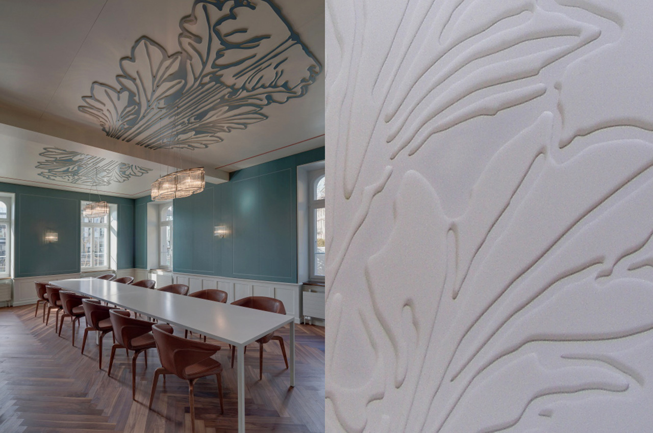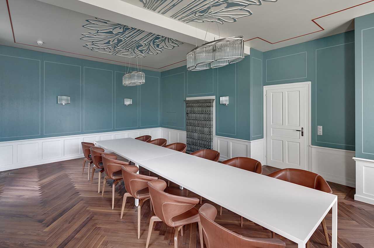 Das Interieur ist in Anlehnung an die Gebäudearchitektur in klassizistischer Farben- und Formensprache neu gestaltet. Differenzierte Raumatmosphären waren das Ziel, die gestalterischen Mittel zur Erreichung dessen mannigfaltig: Das Mobiliar, individuell gefertigte Beleuchtungskörper, furnierte und perforierte Akustikelemente, ein gefrästes Akanthus-Deckenrelief und eine massgefertigte Ginkgo-Tapete. Die Beschriftungen aus geöltem Nussbaumholz vollenden das hochwertige Ambiente.