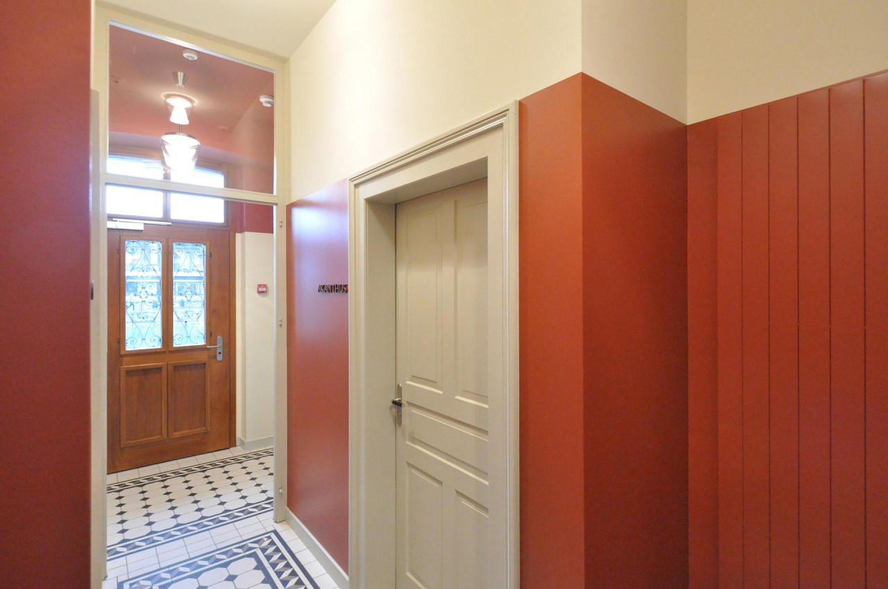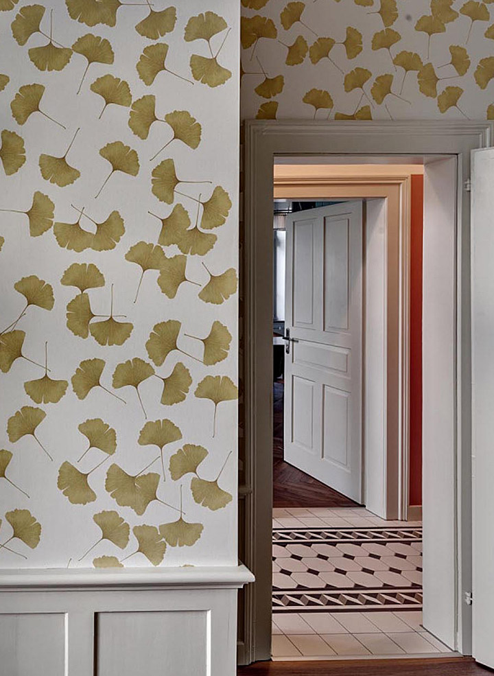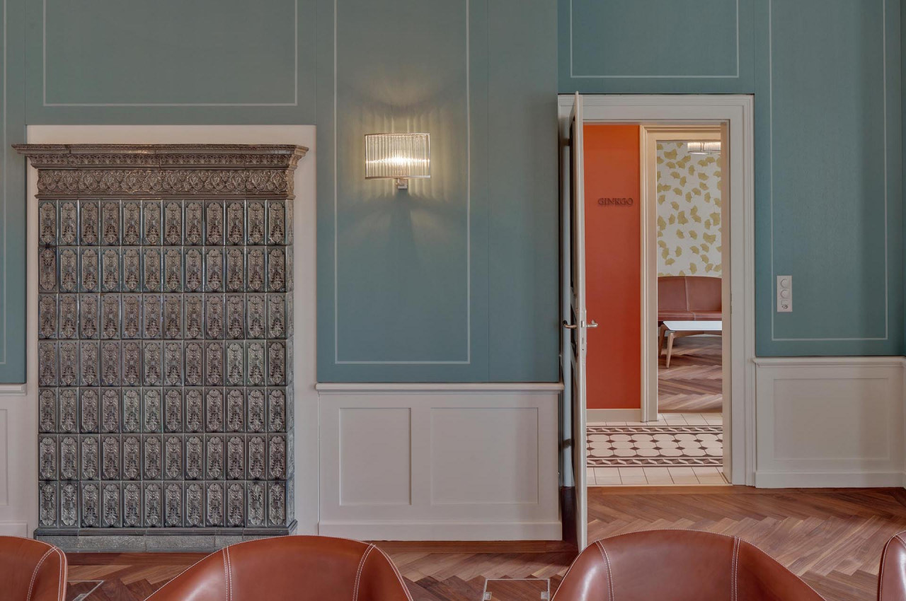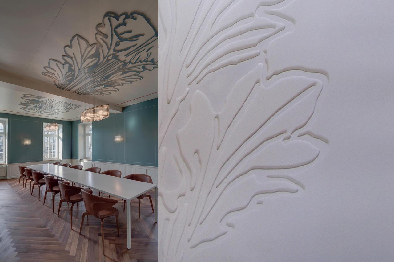 Das Interieur ist in Anlehnung an die Gebäudearchitektur in klassizistischer Farben- und Formensprache neu gestaltet. Differenzierte Raumatmosphären waren das Ziel, die gestalterischen Mittel zur Erreichung dessen mannigfaltig: Das Mobiliar, individuell gefertigte Beleuchtungskörper, furnierte und perforierte Akustikelemente, ein gefrästes Akanthus-Deckenrelief und eine massgefertigte Ginkgo-Tapete.