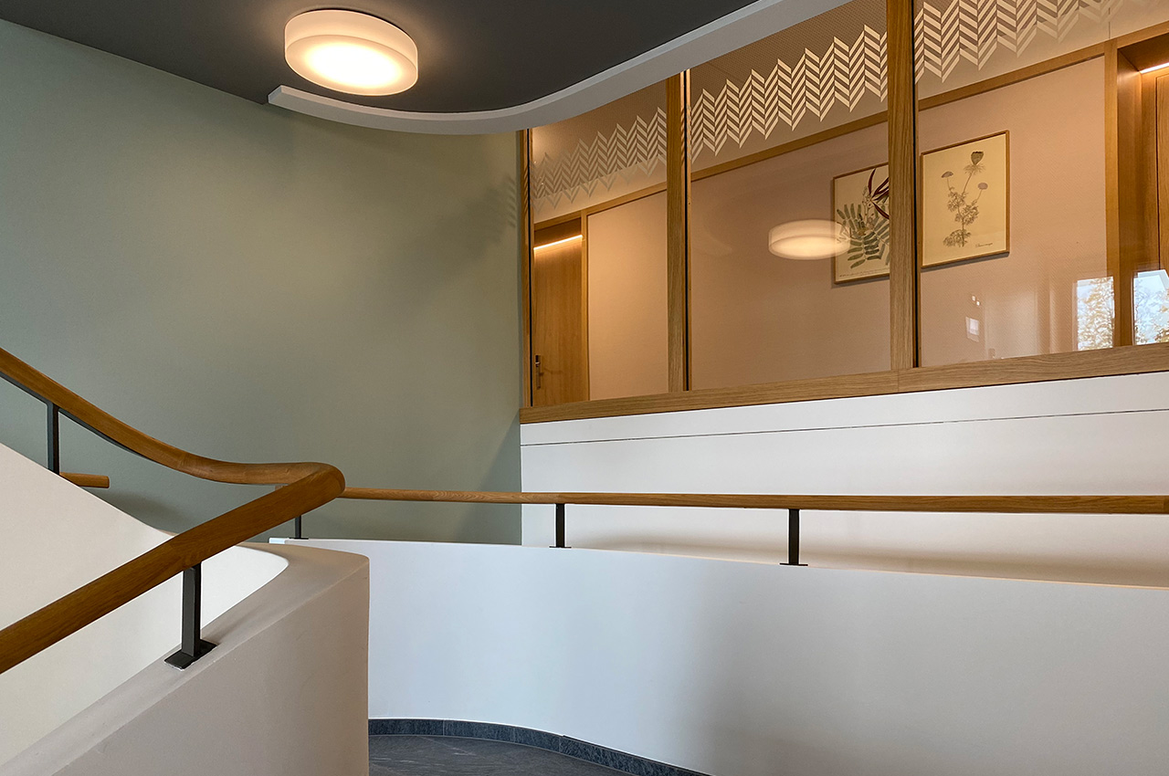 Grossformatige Wandgrafiken mit organischen Formen und zahlreiche Bildergalerien beleben nun die Korridorzonen, während Infotafeln und Pflanzengrafiken der Identifikation und Orientierung dienen.