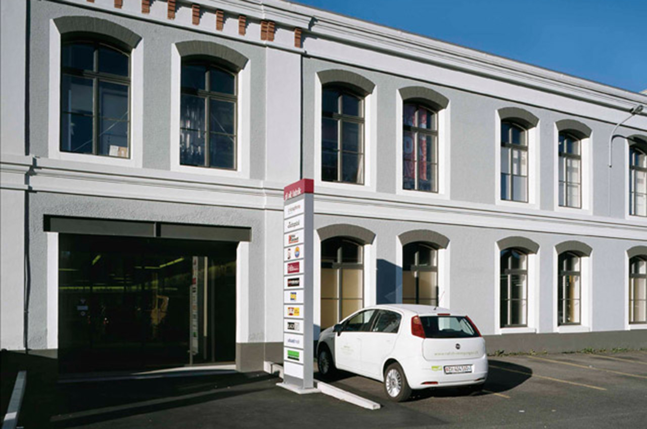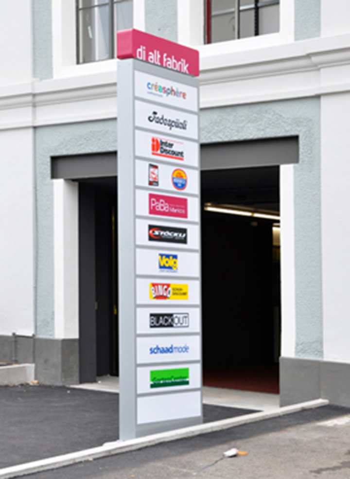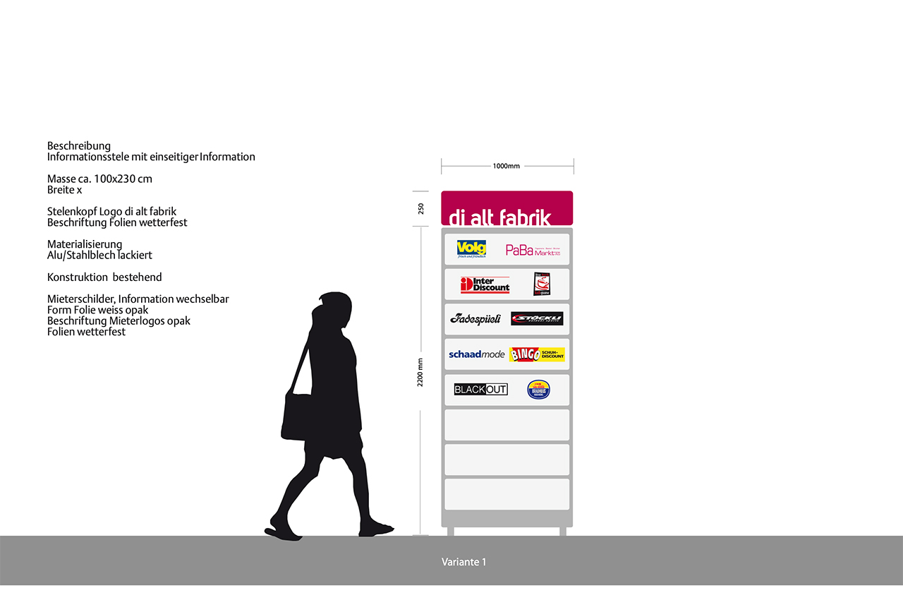 Nach Auslagerung der Textilproduktion wird die ehemalige Fabrik seit Mitte der 80er Jahre als Einkaufszentrum genutzt. Durch umfangreiche Umbaumassnahmen und die Implementierung neuer Verkehrswege wurden spezifische Anforderungen an die Signaletik gestellt. Die gestalterischen Lösungen zeigen sich in der Entwicklung und Gestaltung der Wortmarke, den übersichtlichen Lageplänen, den informativen Hinweisschildern und den gut sichtbaren Bodenmarkierungen.