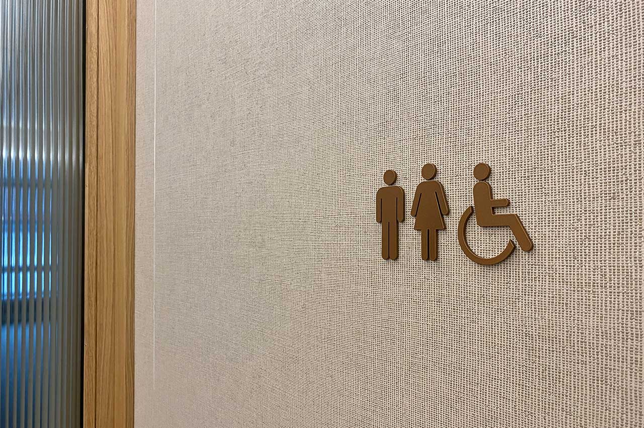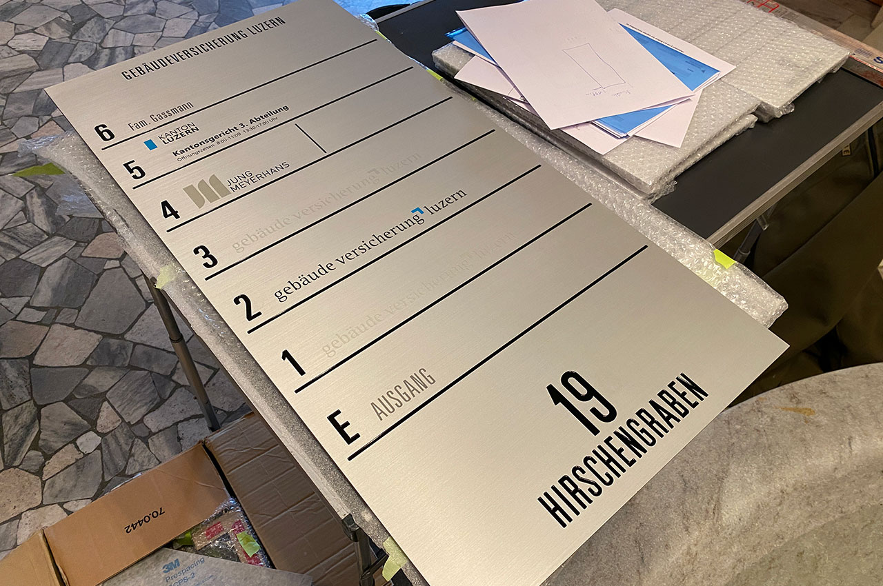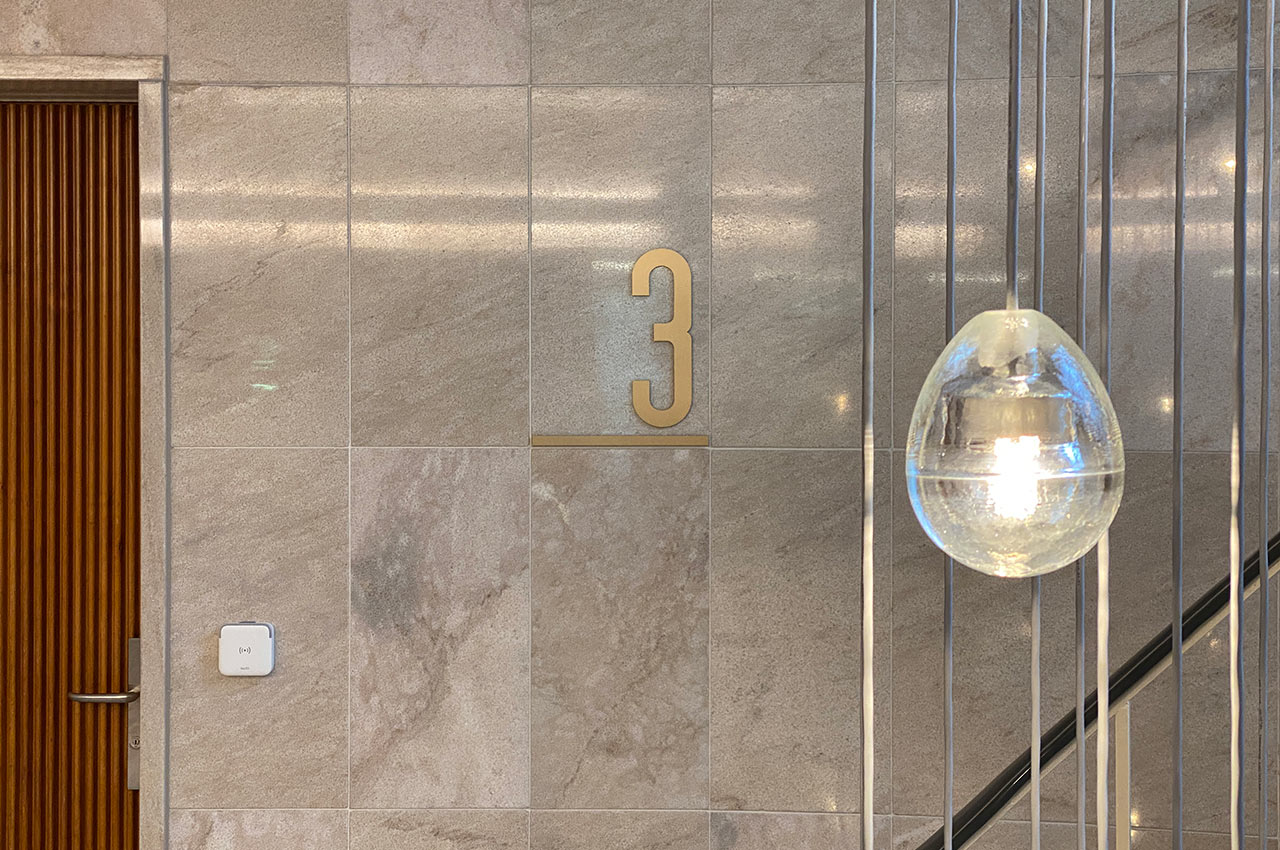 Im prägnanten Eingangsbereich wurden, mit erheblichem Aufwand, Fragmente der Ursprungsbeschriftung instandgesetzt und umfänglich ergänzt. Die bauzeitliche Bestandstypografie spiegelt sich sowohl in der Gestaltung der neuen Mieterübersicht, als auch in der Etagenbeschriftung aus eloxiertem Aluminium wider. Die Übersicht im repräsentativen und denkmalgeschütztemTreppenhaus bietet eine hochwertig materialisierte und mit gravierten Ziffern ausgestattete Tafel. Der Gebäudeidentifikation im Stadtraum dienen selbstleuchtende Beschriftungen an den Fassaden.