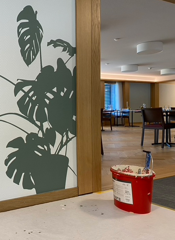 Die Farbgebung der grob verputzten Gebäudehüllen invertiert sich, im Inneren charakterisieren grossflächige Wandgrafiken und farbige Deckenuntersichten die Erschliessungszonen.