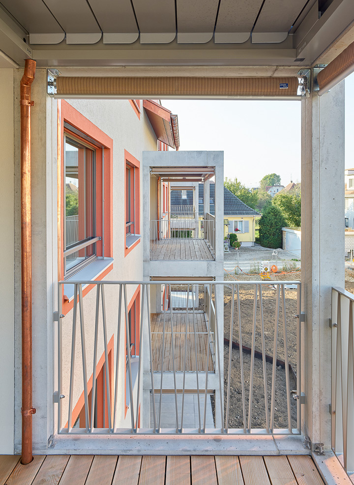 Die Farbgebung der Überbauung wirkt identitätsbildend und deren Gestaltungsprinzip ist einfach zu erfassen: Farbwahl und Farbanordnung dokumentieren die Bautypen, als Gliederungselement fungieren farblich und strukturell abgesetzten Sockelflächen und die invertierten Fensterumfassungen.
