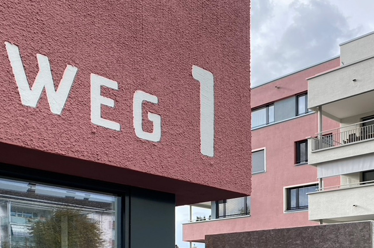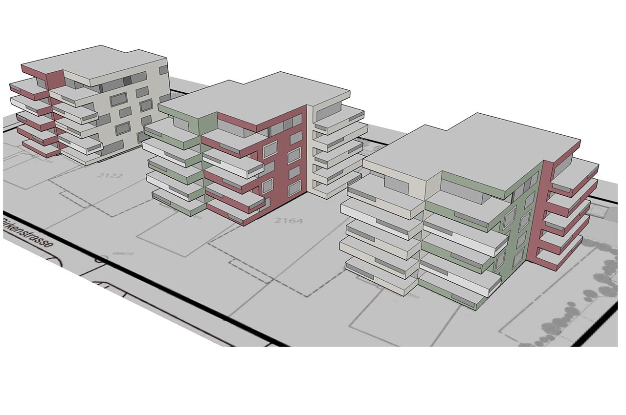Die formal identischen Gebäude, jeweils in 2-3-Spänner-Konfiguration, werden durch individuelle Farbgebung optisch strukturiert. Trotz des identischen Gestaltungsmusters entstehen so unterschiedlich wahrgenommene Gebäude mit reizvollen Qualitäten. Der Wechsel der Farben analog der Volumen betont einerseits die Plastizität der Körper und trägt andererseits zur optischen Redimensionierung der Gebäude bei.