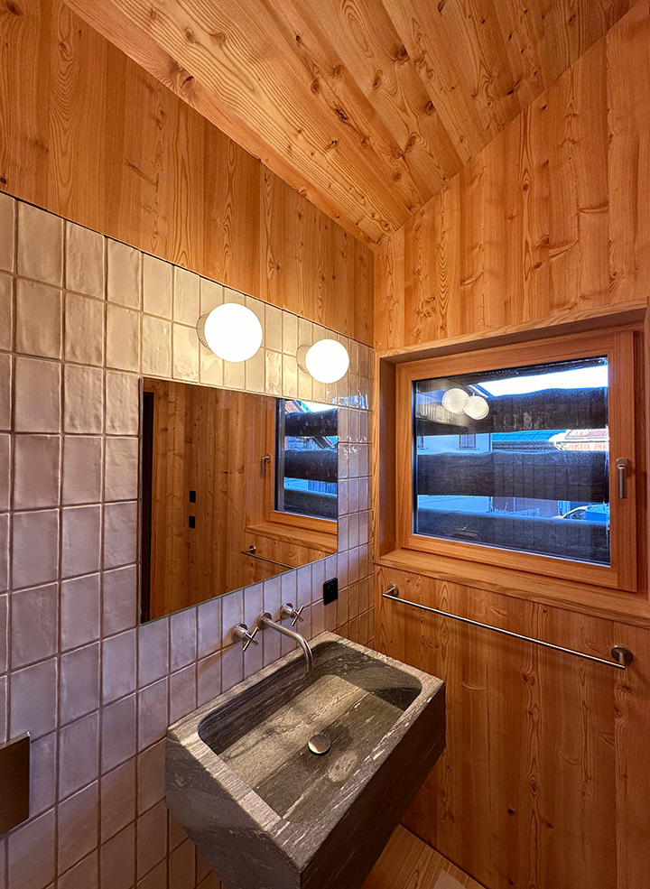 Besonders stimmungsvoll sind die archaischen Valserstein-Waschbecken, die bronzefarbenen Armaturen, die kreidefarbenen Fliesen mit handwerklichem Charakter und die Vorhänge aus mauvefarbenem Wollstoff. Ein abgestimmtes Beleuchtungs- und Möbelkonzept vervollständigt das gesamte Raumambiente.
