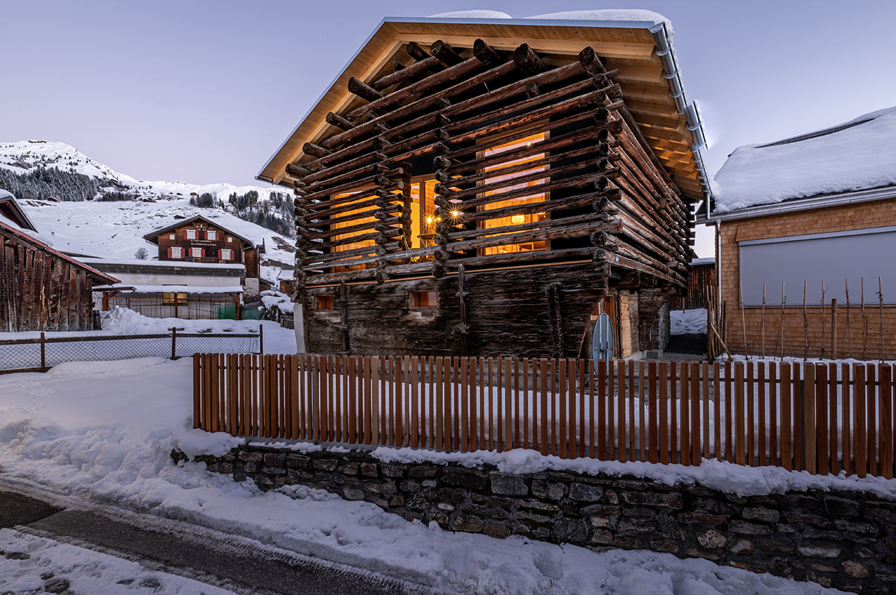 Dieses historische Stallgebäude im Val Lumnezia, wurde komplett entleert und in der Folge neu ausgebaut. Die markante Holzkonstruktion des Gebäudes zeugt von seiner ursprünglichen Nutzung. Erneuerungsarbeiten fanden an Dach, Fassadensockel und Umgebung statt.
