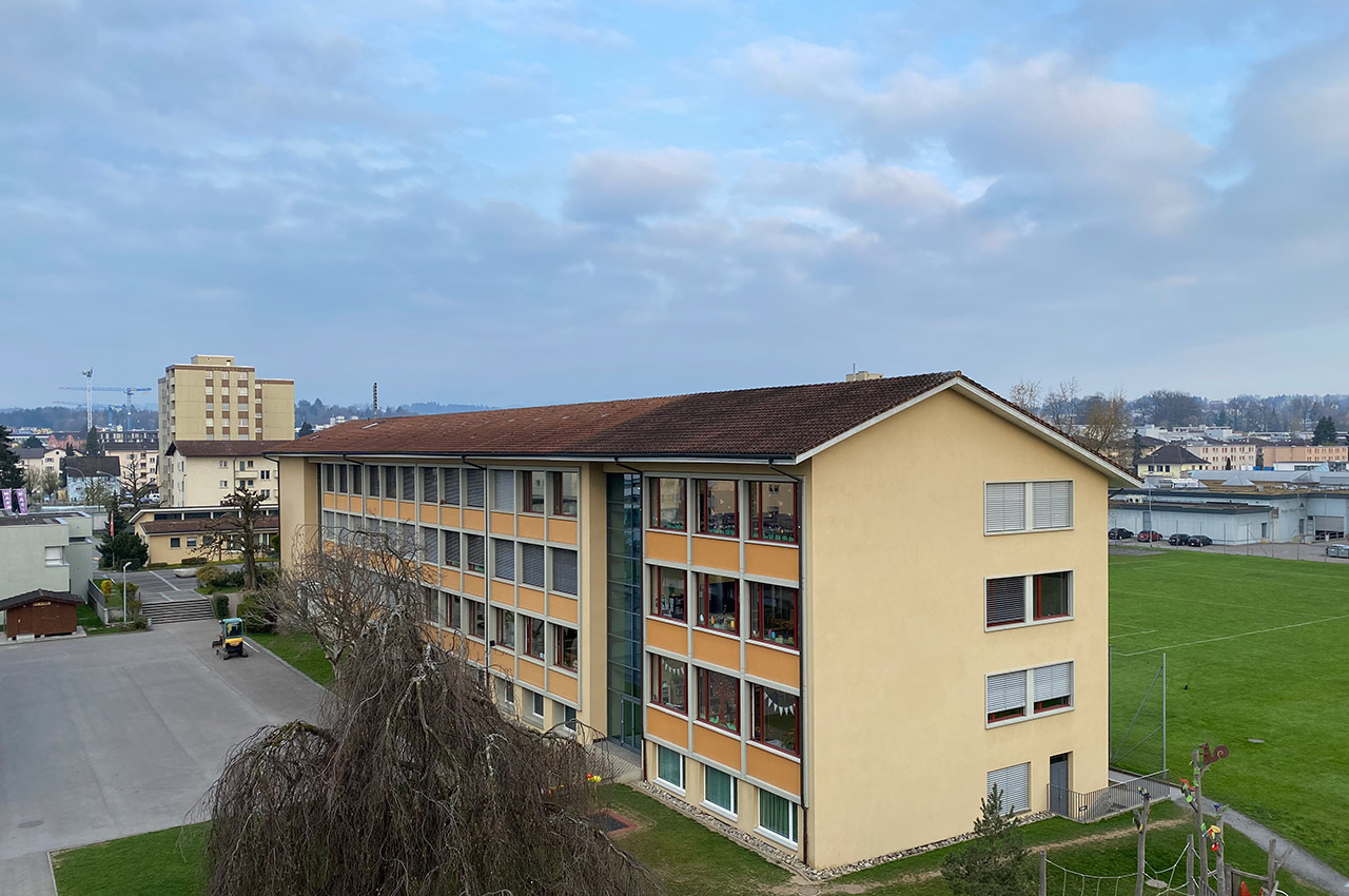 Das 1956 erstellte Schulhaus Meierhöfli grenzt direkt an Wohngebiete, Industrie- und Gewerbezone.