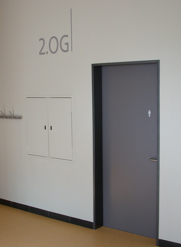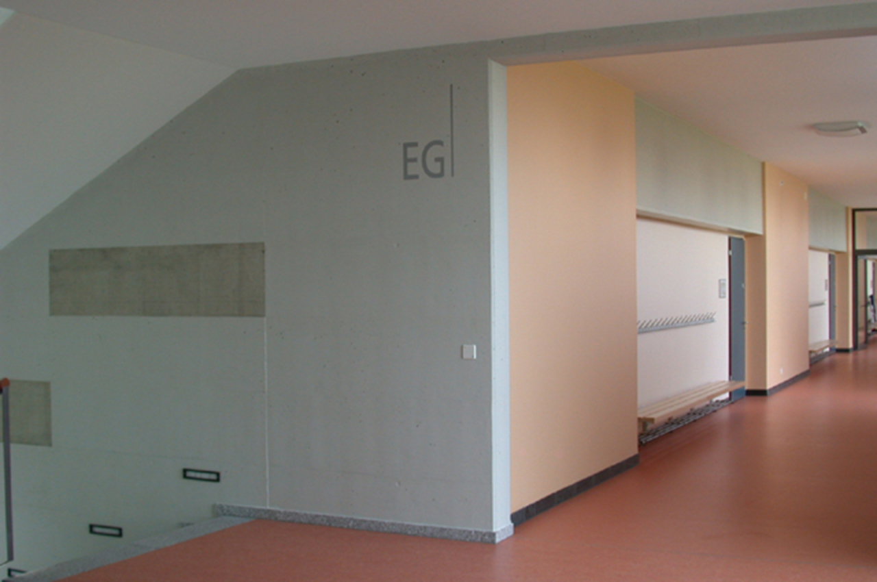 Die Farbgebung ist Bestandteil der Signaletik. Sie orientiert im Haupttrakt stockwerksweise und differenziert die Gebäudefunktionen Haupttrakt, Turnhalle, Spezialtrakt und Pavillon.