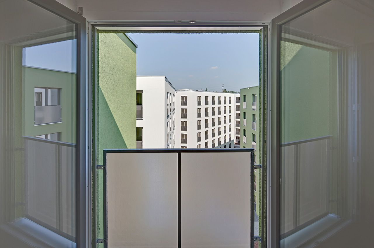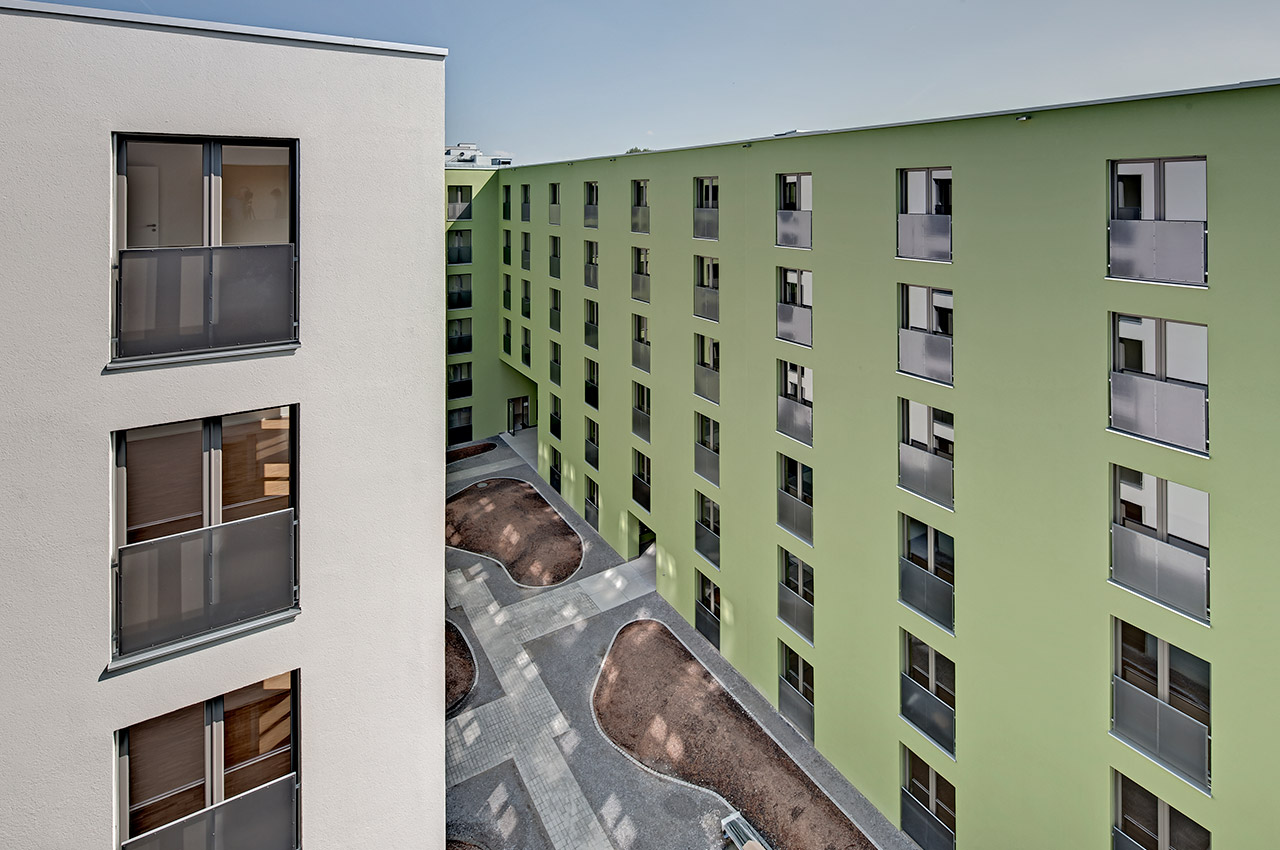 Die im Innenhof präsenten Haustypologien (Haupthaus, Punkthäuser) unterscheiden sich farblich voneinander. Ziel ist, eine einfache und wirkungsvolle Differenzierung der Bauvolumen zu erzeugen und die typologische Besonderheit der Punkthäuser zu dokumentieren. Die Fiberglas-Absturzsicherungen der hofseitigen Fenster und Brüstungen sind monochrom, in differenzierten Transluzenzgraden gefärbt.