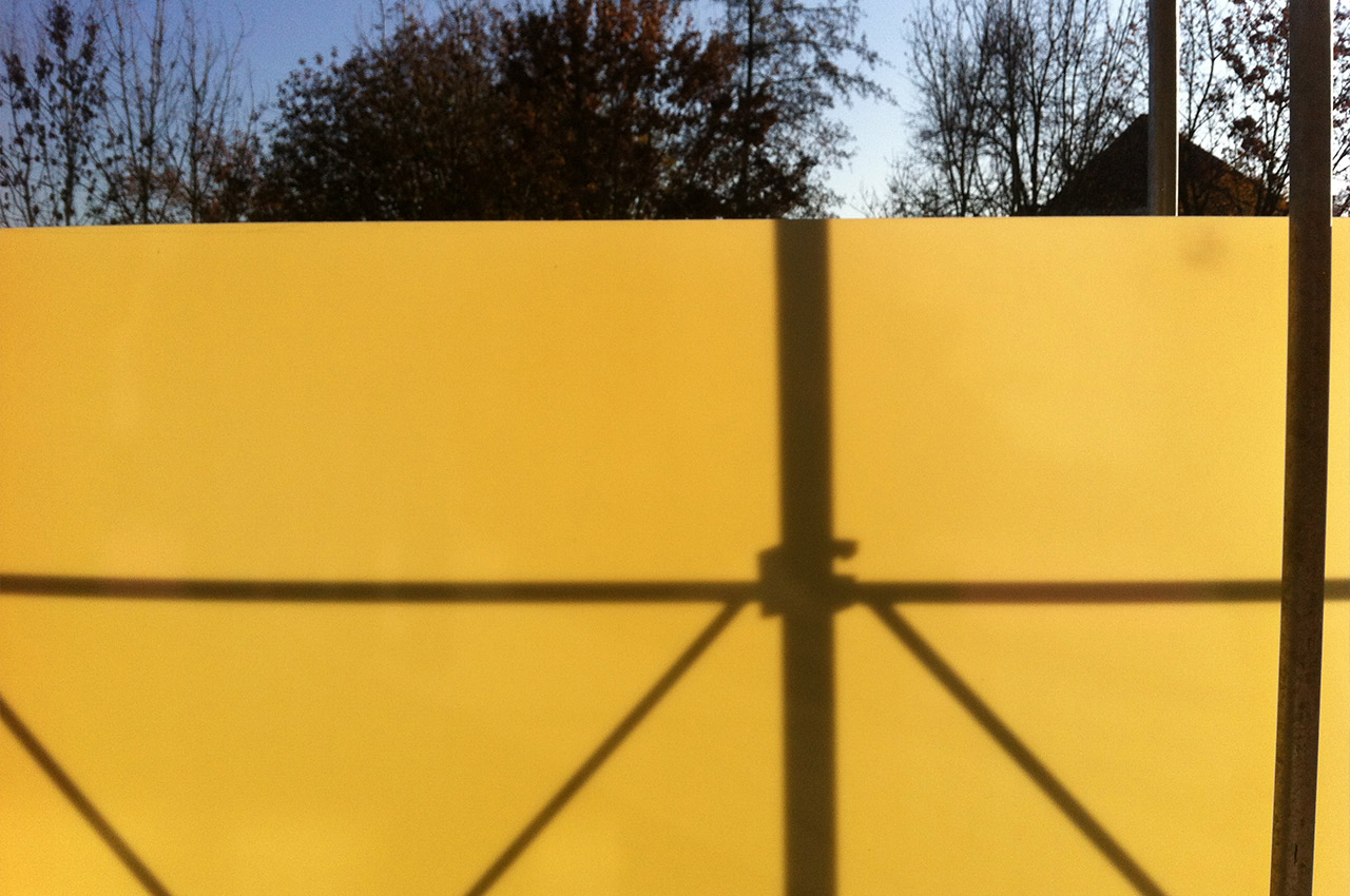 Die Hülle der Baukörper erscheint in Ockerfarbe. Sowohl der Verputz der Kompaktfassaden als auch die Fiberglas-Brüstungen der Balkonfassaden sind in diesem Erdfarbton beschichtet, bzw. gefärbt.